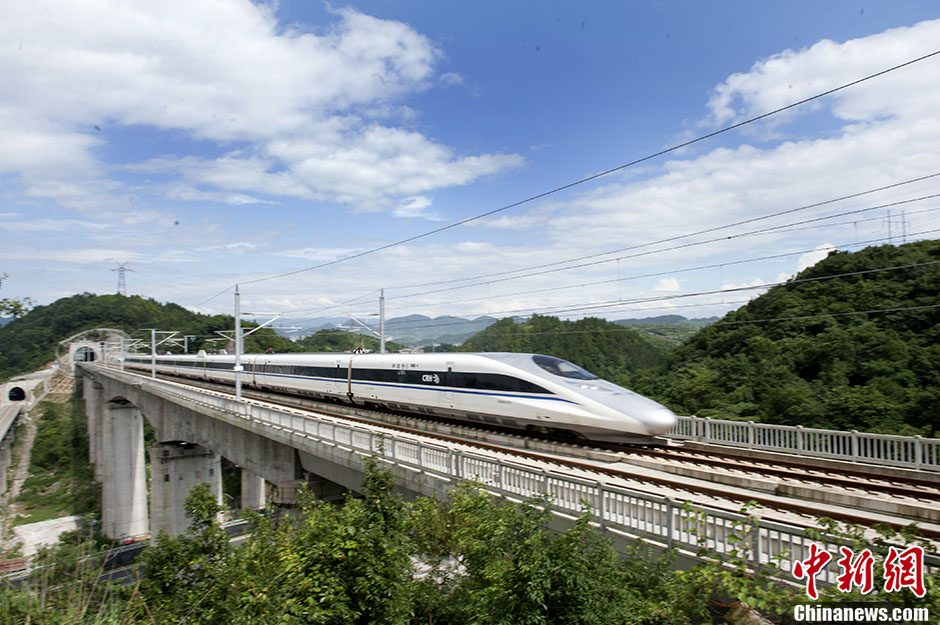 6月21日,贵广高铁、沪昆高铁穿隧道而过。贵广高铁设计时速300km/h, 目前运行速度250km/h,目前是西南云贵川地区最便捷的铁路出海大通道,大大缩短了西南与珠三角地区间的时空距离,乘客乘坐相比之前节省了很多时间。另外在成贵高铁开通之前,如乘坐普速客车通过贵阳中转高铁,四川各地至珠三角地区的行车时间普遍能由40小时缩减至24小时以内,且按普速硬卧与动车二等座对比计算,票价几乎不变。沪昆铁路客运专线贵州段全长559.5公里,是世界上跨度最大,地形起伏大、地质结构最复杂的铁路。中新网记者李泊静 摄