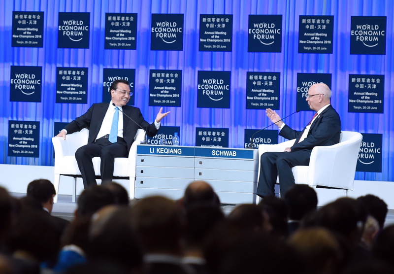6月27日,国务院总理李克强在天津梅江会展中心出席2016年夏季达沃斯论坛开幕式并发表特别致辞。这是致辞结束后,李克强回答世界经济论坛主席施瓦布代表企业家向他提出的问题。新华社记者张铎 摄