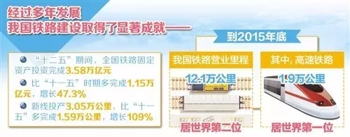 截至2015年底,中国全国铁路营业里程达到12.1万公里(赤道周长约4万公里,中国铁路可绕地球三圈),居世界第二位,看似已经十分发达,但还不到美国的二分之一,相对于中国庞大的人口数量,铁路建设还不足,有很大的发展潜力。