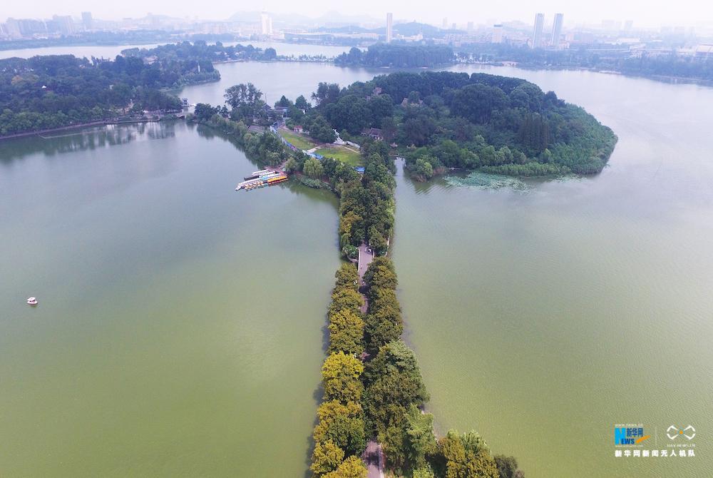 南京玄武湖方圆近五里,分作五洲环洲、樱洲、菱洲、梁洲、翠洲,洲洲堤桥相通,浑然一体,处处有山有水。宋人欧阳修也曾写道“金陵莫美于后湖;钱塘莫美于西湖”,玄武湖为风景园林,亦为文化胜地,历代文人骚客,政要名流都曾在此留下身影,皆为后人传为美谈。图为俯瞰翠洲长提。新华网刘沛摄 飞手 孙帅