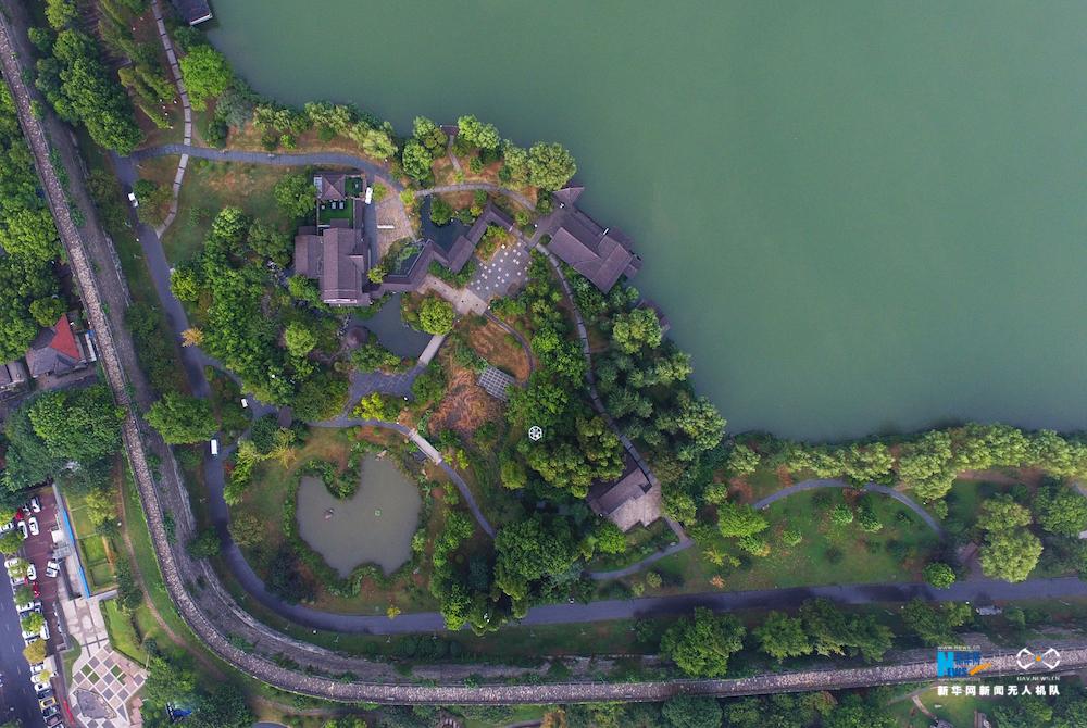 图为湖边玄圃,是梁朝昭明太子编撰《文选》的地方。新华网 刘沛摄 飞手 孙帅