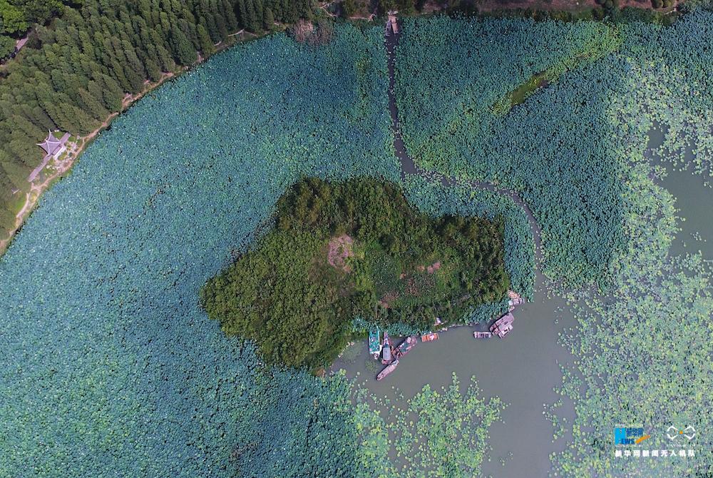图为航拍湖中荷塘。新华网 刘沛摄 飞手 孙帅