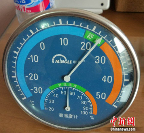 11月17日,北京天通苑一居民家中温度计显示室温超过20度。中新网邱宇 摄
