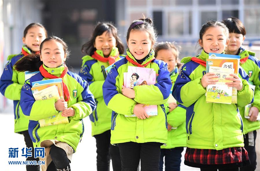2月13日,安徽亳州市风华小学的学生领到了新课本。当日,我国多地中小学2017年新学期开学。 新华社发(刘勤利 摄)