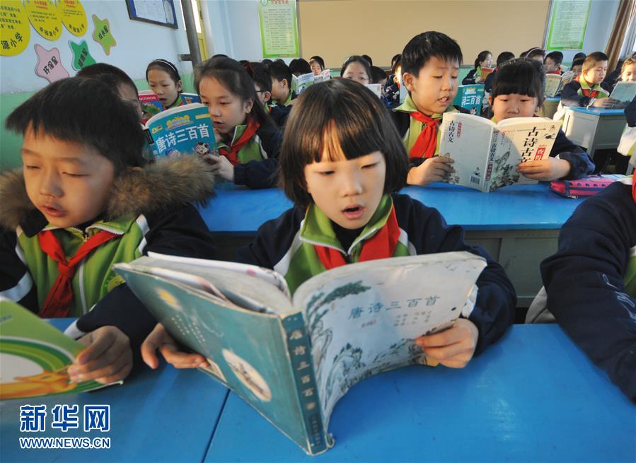 2月13日,河北省邢台市桥西区幸福源小学学生在开学第一课上诵读《唐诗三百首》等图书。当日,我国多地中小学2017年新学期开学。新华社发(黄涛 摄)