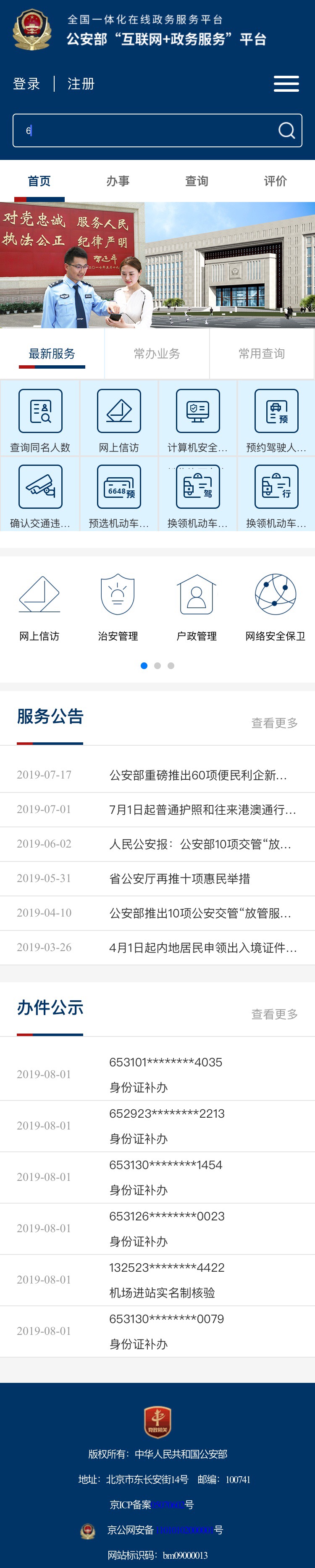 厉剑通报,公安部“互联网+政务服务”平台今天正式上线。公安部坚持公安“放管服”改革与互联网科技相融合,组织各级公安机关深入推进“互联网+公安政务服务”工作。各级公安机关紧贴群众需求,勇于推陈出新,不断增强“互联网+公安政务服务”工作的创新活力。通过网站、APP、公众号、小程序,将服务的入口从线下移到线上;通过在线申请、网上受理、远程寄递等多种方式,有效打通了网上服务的“最后一公里”;通过刷脸认证、一键挪车等便捷应用,将服务的触角延伸至各个角落。