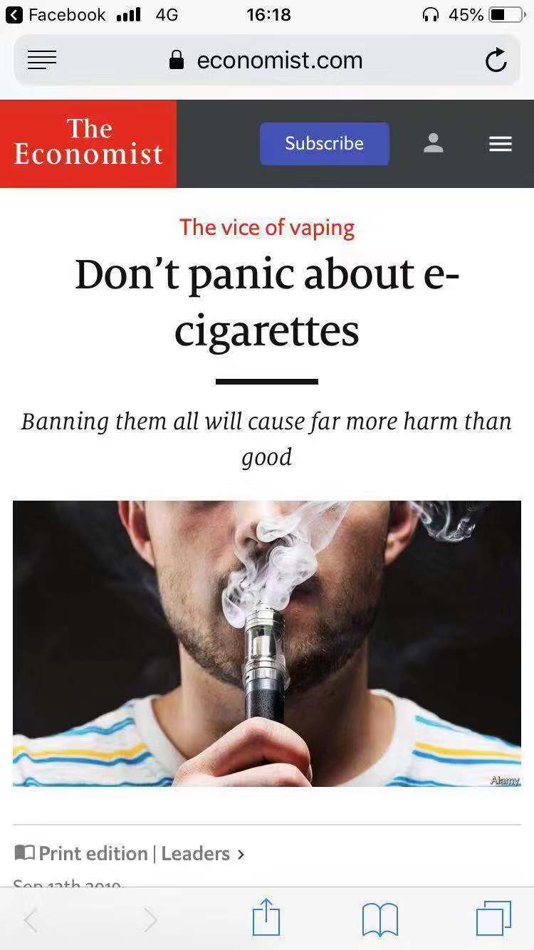 已经拥有170多年历史的权威媒体《经济学人》表示,公众对电子烟的分歧其实源自当下电子烟的发展乱象。一个核心事实是:美国最近对外报道中,引发争议的电子烟并非来自正规商店购买的产品,而是来自街头的劣质货。6起有关电子烟的投诉纠纷中,有5起用户使用的是非法购买的电子烟产品。剩下1起,其烟油是用户从俄勒冈州一家合法大麻商店自购的。