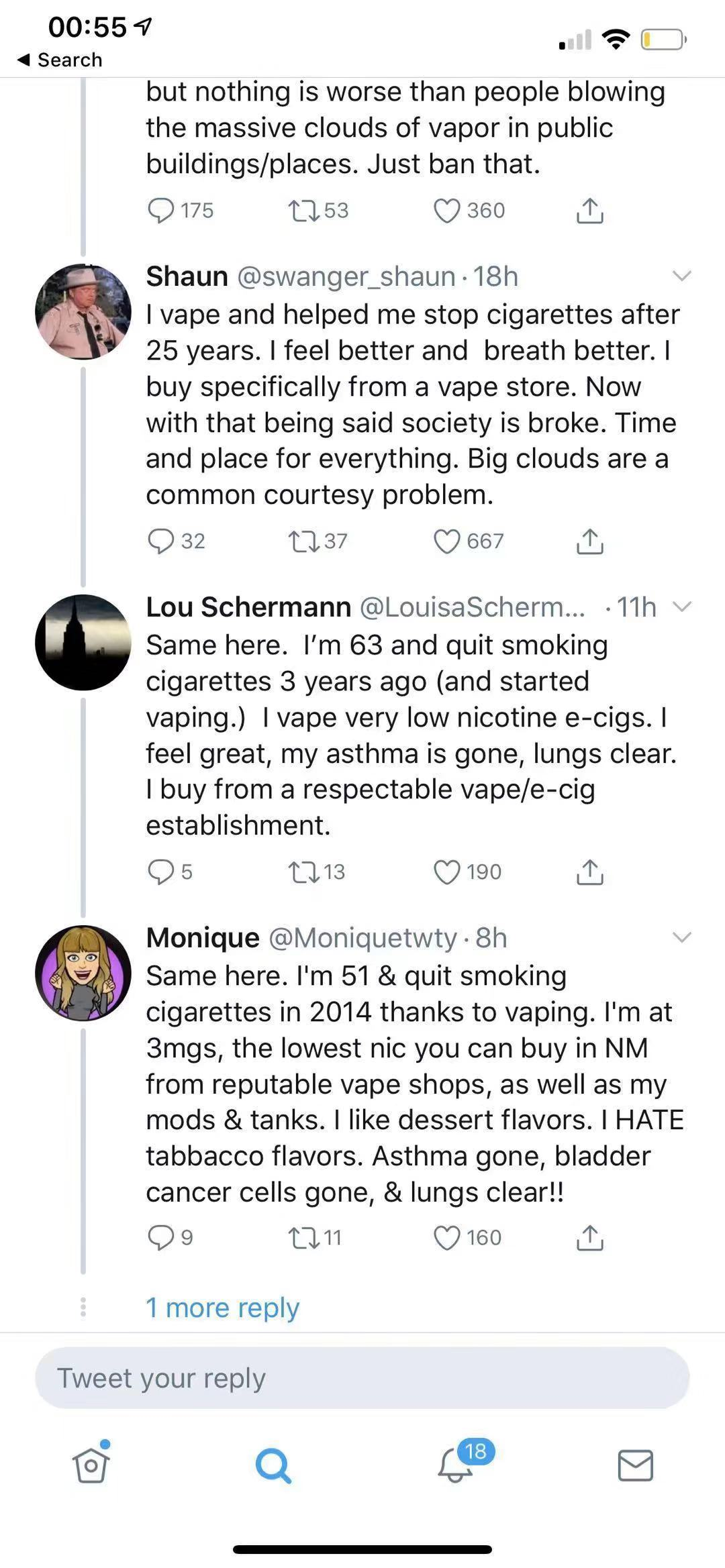有超过1.28万人在这条推特下留言,还有6.15万人点赞。其中有人称:“这种替代品在我25岁的时候帮我戒掉了卷烟,我的肺部也因此变得干净了。”另一位63岁的老者表示:“我已经3年不抽卷烟了,这种低尼古丁的产品让人感觉更好。”投资者 Michael Coudrey则表示,“不希望过度监管伤害到电子烟企业主或经销商。因为与可能由电子烟造成的6人死亡相比,每年由传统烟草造成的死亡人数达60万。”