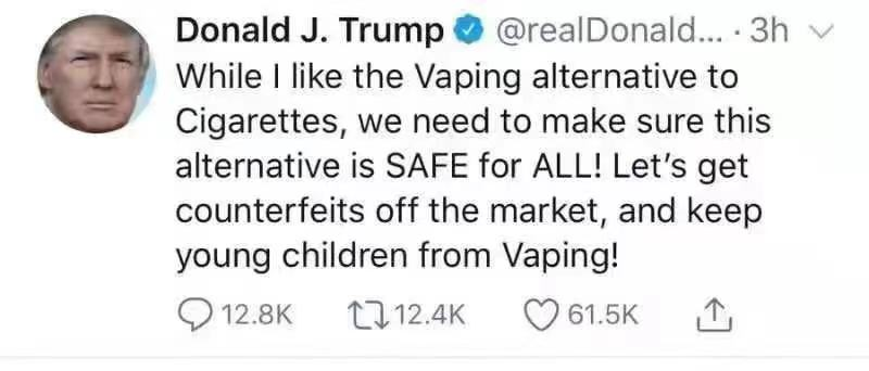 一个有关电子烟的“逆转”在中秋完成——当地时间9月13日晚,美国总统特朗普发布推特称:“我更喜欢雾化电子烟能替代传统香烟,但需要确保这种替代方案对所有人都是安全的。让我们把伪劣品从市场上清除,让我们的孩子远离电子烟!”