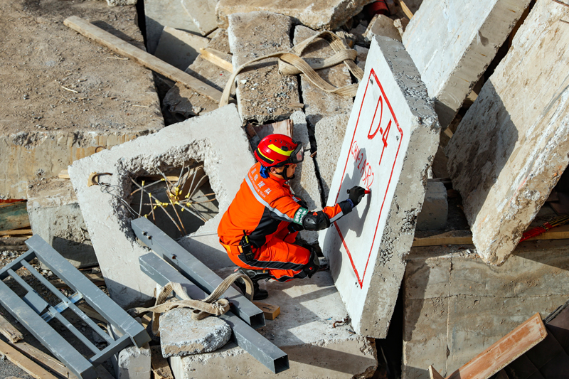 10月21日,中国救援队在北京市消防救援总队大兴训练基地进行地震搜救演练,这是队员在演练中做记号。新华社记者 沈伯韩 摄