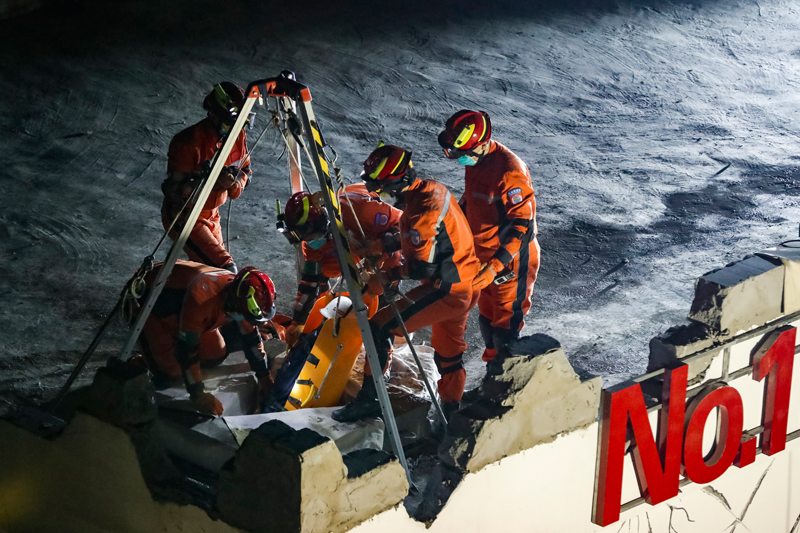 10月21日,中国救援队在北京市消防救援总队大兴训练基地进行地震搜救演练,这是队员在演练中成功将建筑物中的“被困人员”营救出来。新华社记者 沈伯韩 摄