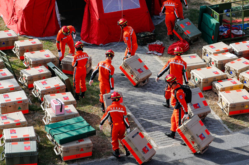 10月21日,中国救援队在北京市消防救援总队大兴训练基地进行地震搜救演练,这是队员在演练中搬运物资。新华社记者 沈伯韩 摄