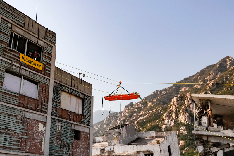10月22日,中国国际救援队在位于北京的国家地震紧急救援训练基地进行地震搜救演练,这是队员在“地震现场”利用转运系统将“幸存者”从高处斜向转移至地面。新华社记者 沈伯韩 摄