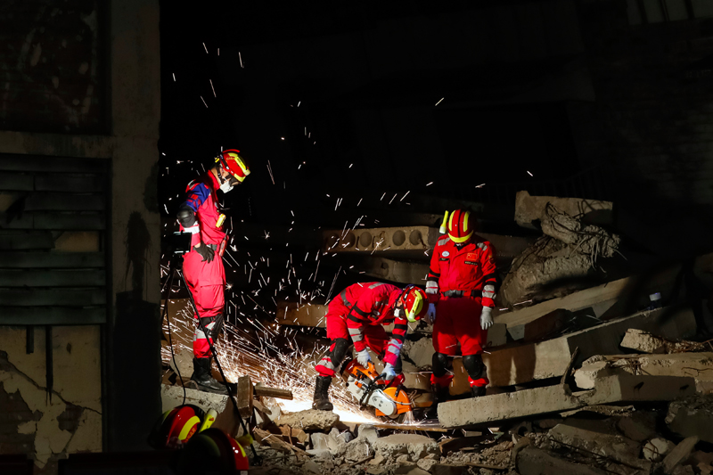 10月21日晚,中国国际救援队在位于北京的国家地震紧急救援训练基地进行地震搜救演练,这是队员在“地震现场”破拆营救通道。新华社记者 沈伯韩 摄