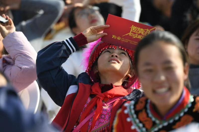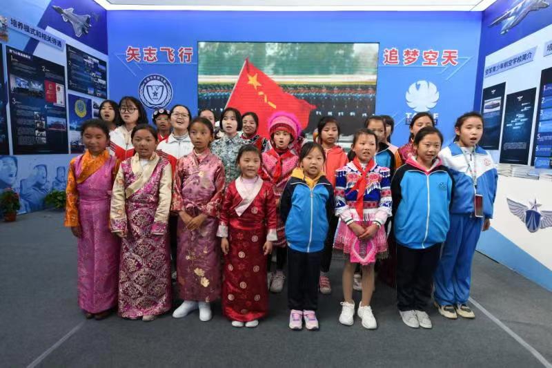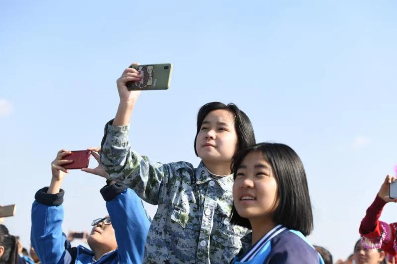 这一切令孩子们应接不暇,伴随阵阵惊叹,大家争相拍照,天空中和地面上的飞机成为此刻她们心目中的主角。来自云南昆明女子中学18岁的李如喜难掩兴奋之情,她说自己从小崇拜军人,眼前这一幕幕震撼的场景更加令她对飞机背后的人肃然起敬。