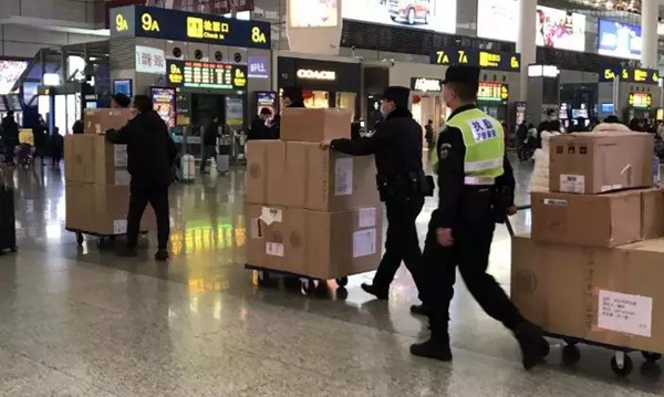 1月24日,民警会同车站工作人员,配合上海市多家医院通过高铁运送援鄂医疗物资