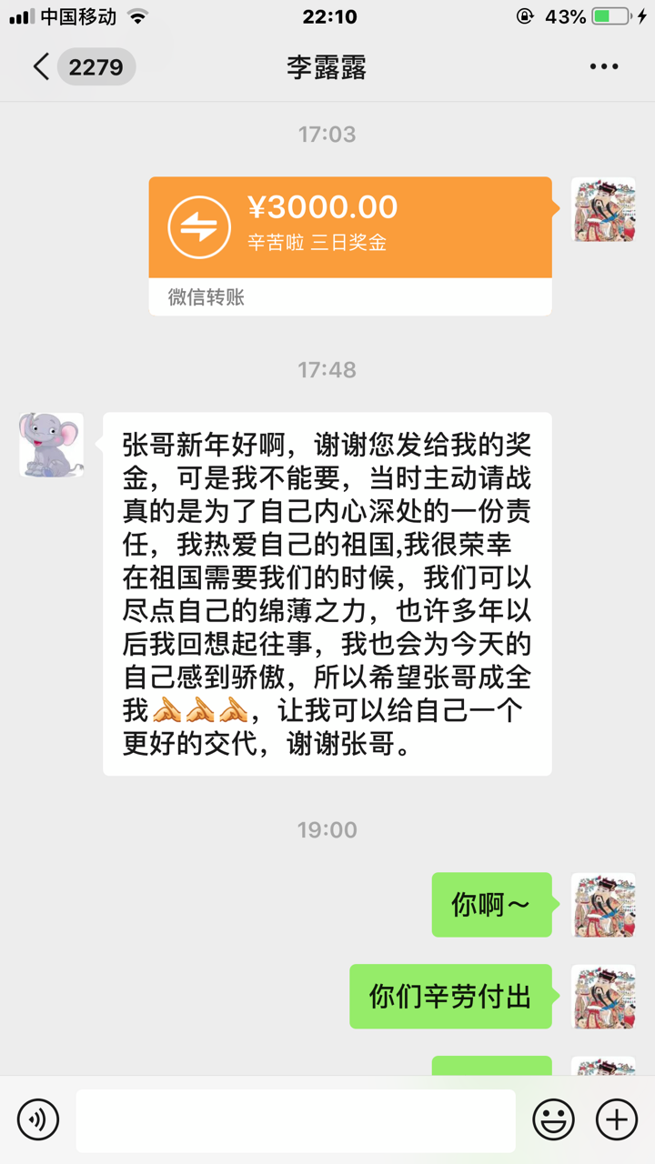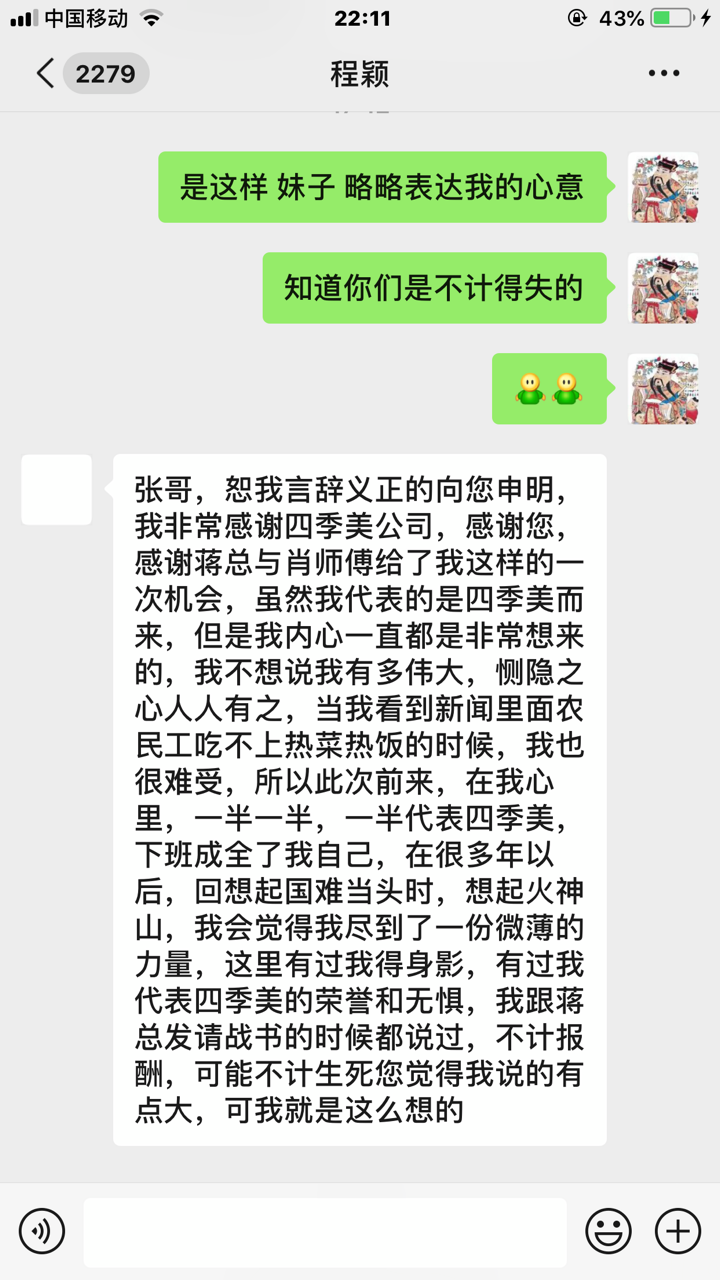 当12名赴火神山的“突击队员”圆满完成任务归来时,张德隽在微信中给每个人转了3000块钱的奖金。“他们没要,还‘批评’了我。”“多年以后,当我回想起往事,会为今天的自己感到骄傲。”员工李露露回复他。“不计报酬、不计生死,发请战书的那一刻我就是这么想的。”张德隽至今仍一字一句记得员工程颖的话。