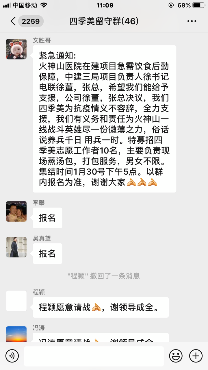 1月27日,张德隽接到了一通来自好友的求助电话,此人是牵头建设火神山医院的中建三局相关项目的负责人。面对工地建设者人数的不断增加,工地食堂的产能告急,为了保证为连续施工的工人们提供热乎的餐食,好友来电正是求助他为支援火神山工地的供餐想想办法。张德隽当即就答应了会去支援,尽管他也不确定疫情当前,是否能召集到愿意去帮忙的员工。没想到的是,招募的消息在留守武汉的员工微信群里发出不到10分钟,就有30几个人主动“请战”。