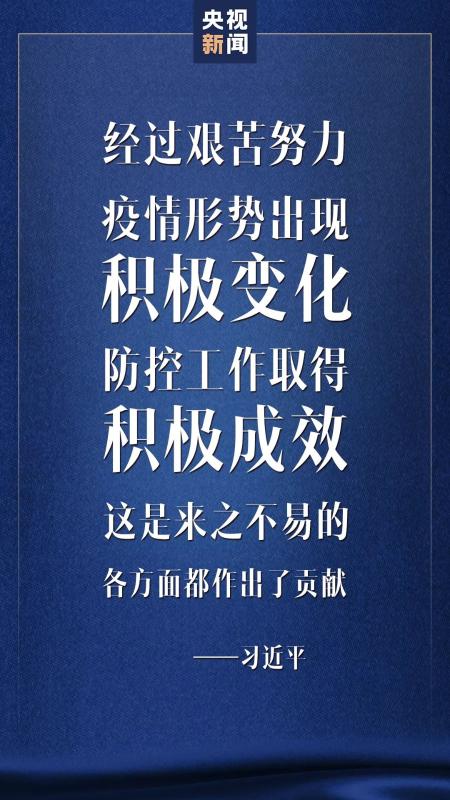 对于当前的疫情形势,习近平指出,经过艰苦努力,疫情形势出现积极变化,防控工作取得积极成效。这是来之不易的,各方面都作出了贡献。