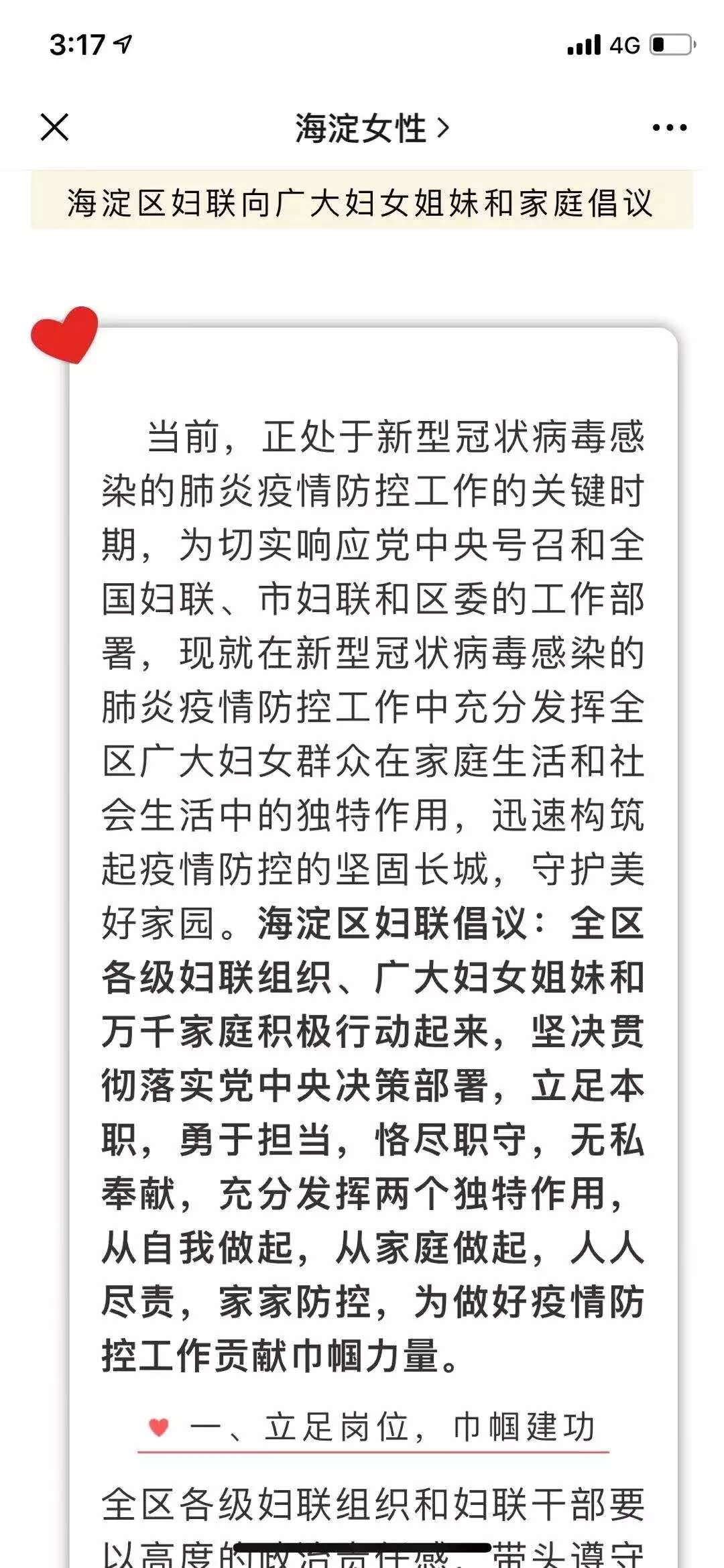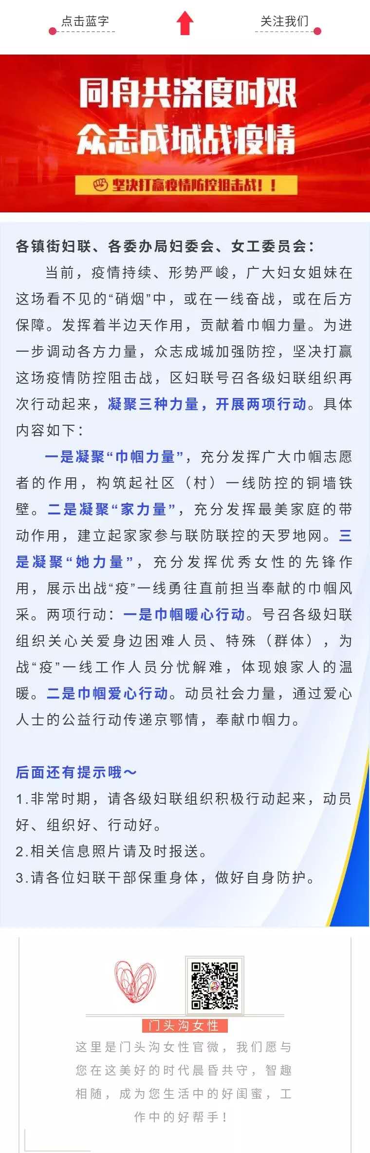 海淀区妇联第一时间向全区妇联组织和广大妇女发出《防控疫情,海淀巾帼“疫”无反顾》倡议书,通过“海淀女性”“网上妇女之家”线上传递“娘家人”的声音和关爱。门头沟区妇联两次发出倡议,号召全区妇女践行“讲奉献、争第一”的门头沟精神,在疫情防控阻击战中争当红色先锋、立足岗位立新功。