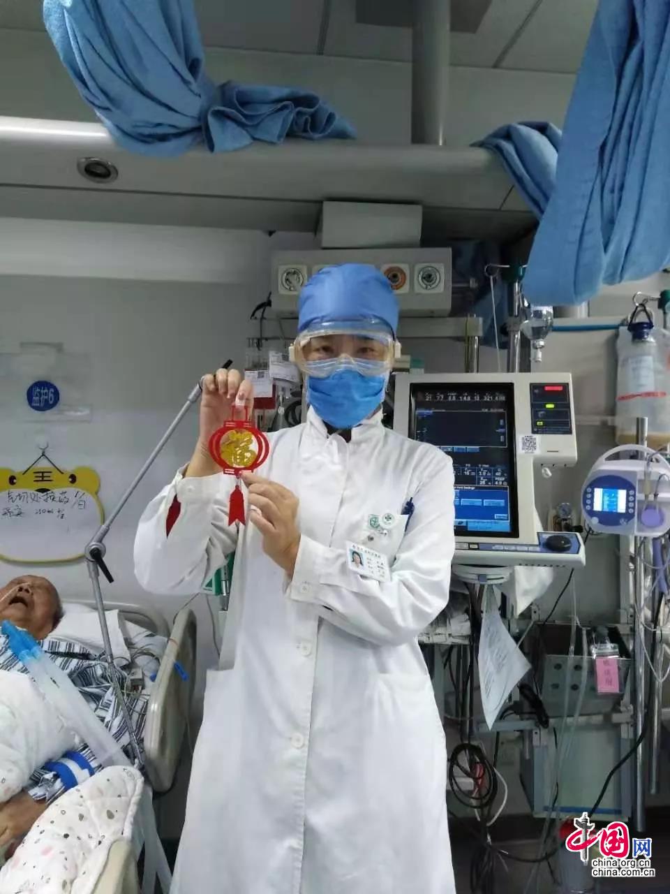 世纪坛医院急诊中心主任、民革海淀区工委王真副主委,大年三十在北京世纪坛医院急诊病房坚守岗位,并为病人送祝福。
