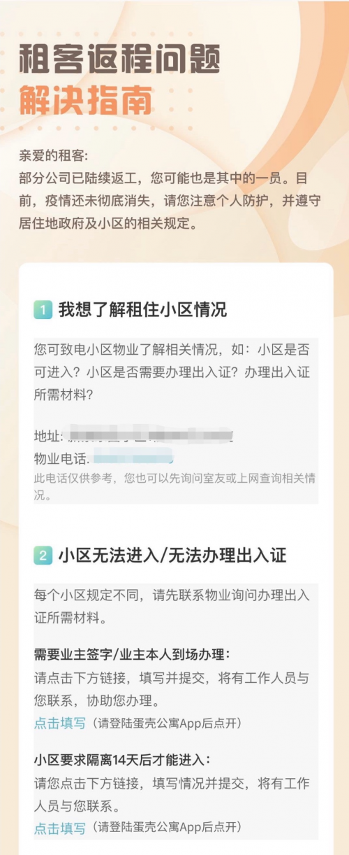 《租客返程问题解决指南》的推出,也得到了租客的一致好评。在一家互联网公司上班的租客小冉说,自己打算最近回工作的城市开始上班,但不太清楚小区是否能够正常进入,在遇到困难时,她通过此次推出的线上路径联系上蛋壳公寓,很快就有工作人员和她联系,帮助她成功办理了出入证件。蛋壳公寓相关负责人表示,此次线上《指南》的推出,利用了蛋壳公寓互联网的优势,让服务更加人性化,更便捷,通过线上化的服务,用户的体验更流畅,服务效率和质量得到了大大提升,同时也尽可能减少疫情期间人员接触,协助政府和社会打赢抗疫阻击战。