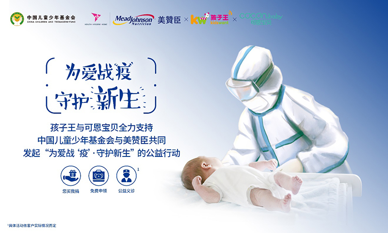 2020年3月5日,由中国儿童少年基金会与美赞臣营养品(中国)有限公司共同发起的“为爱战‘疫’·守护新生”公益行动,得到了全国性连锁零售商孩子王和可恩宝贝的全力支持,两家零售合作伙伴将积极发挥连锁门店优势资源,在全国范围内开展捐赠活动,协同更多社会力量,共同驰援武汉孕产妈妈,守护新生,点燃希望。