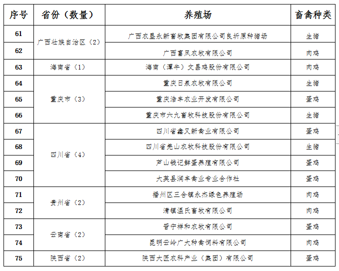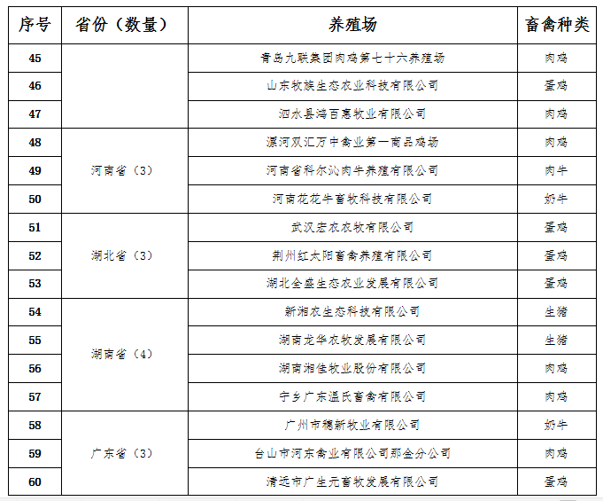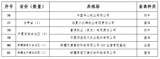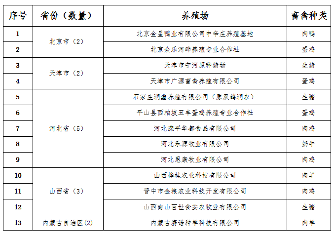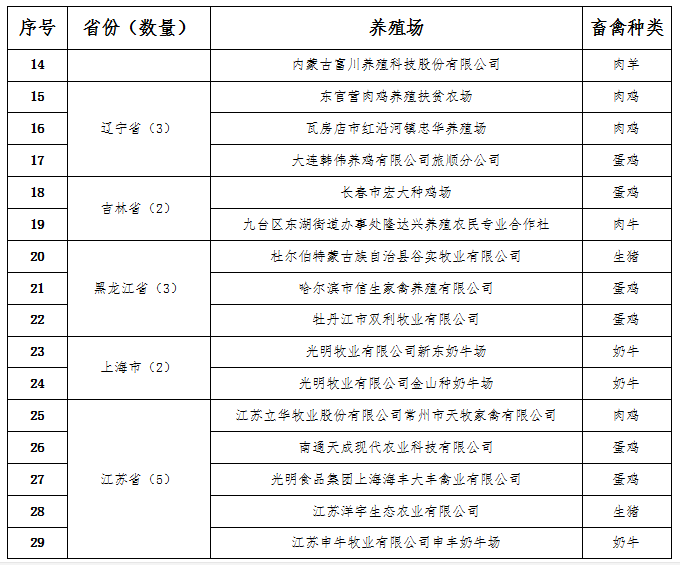 中国网北京3月18日讯(记者胡俊)农业农村部消息,3月16日,农业农村部确定81家养殖场为全国首批兽用抗菌药使用减量化行动试点达标养殖场,并向社会发布达标养殖场名单。此次发布的达标养殖场,来自全国29个省(区、市)和新疆生产建设兵团,涵盖了生猪、肉牛、肉羊、奶牛、蛋鸡、肉鸡、肉鸭等主要畜禽品种。