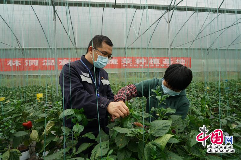 疫情期间,南方电网广东中山供电局扶贫干部高锋,正在定点扶贫村肇庆市林洞村彩椒种植大棚内,和农户一起检查彩椒幼苗的生长情况。谭茂茜 摄