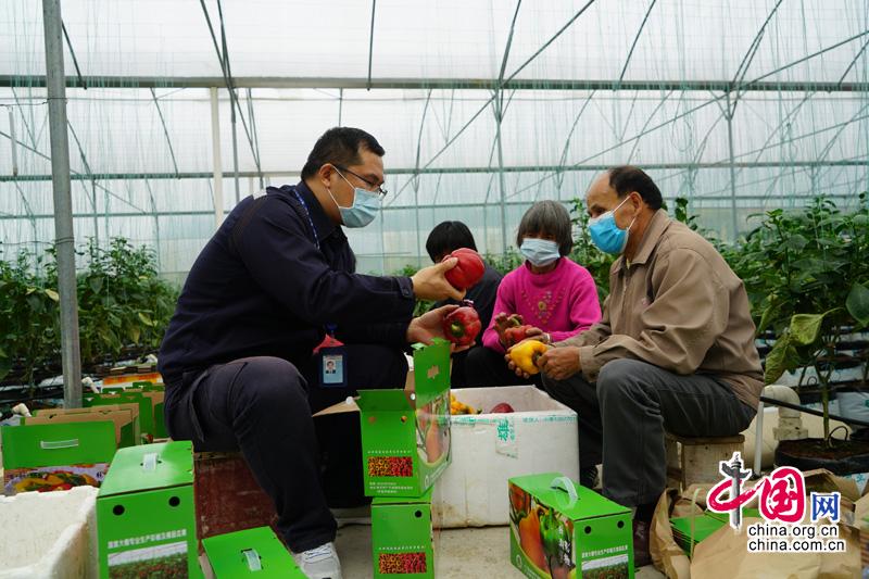 春天里,大棚里的彩椒苗比较潮湿,结出的果子质量不好,扶贫干部和村民一起,严把成品质量关。谭茂茜 摄