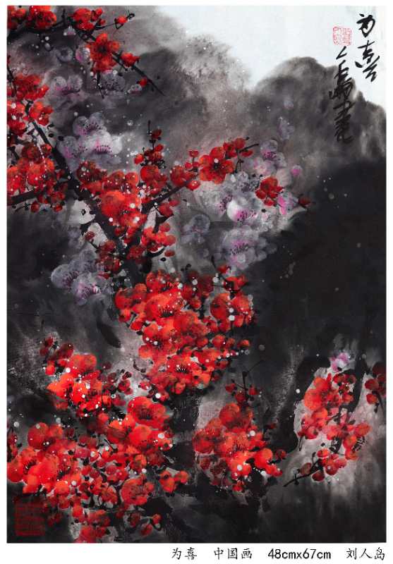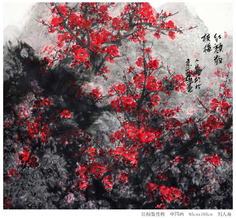 《红颜数枝梅》系列作品,展现了刘人岛先生与时俱进、践行以人民为中心的创作理念,将文艺作品与时代同频共振,在众声喧哗的繁荣与现代的焦虑中展现了凝聚共识、不畏艰险的重要性。面对病毒的肆虐,看到4万多军地医务工作者抛家舍业、奔赴抗击疫情的第一线,艺术家被抗击疫情的精神所感召、所触发。作为一名艺术家,感悟中华民族在苦难面前传承“艰难苦困、玉汝于成”“一方有难、八方支援”的历史精神,以视民如伤的情怀为根基,用艺术来展现中华民族不畏严寒、不惧困难的勇气,这些艺术作品创意传神,用艺术展现我们医者仁心、大医精诚的文化品质,让人耳目一新,精神为之振奋。这些系列作品用梅花寓意来赞天地之化育,如春风化育、如时雨化之。梅花香自苦寒来,表达了民众抗击疫情的决心和信心。以中国传统山水画为载体,以传统的水墨为主线,格调清晰,主题鲜明,以"近距离"的观察与感性认识为艺术创作的源泉,寓意战胜病魔的决心,用升华的意象展示梅花艺术的灵魂与主题。展现了刘人岛教授与时代同命运的艺术特征。