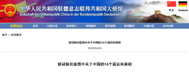 【海外网4月25日|战疫全时区】4月24日,中国驻德国大使馆网站发布《新冠肺炎疫情中关于中国的16个谣言和真相》,全文如下: