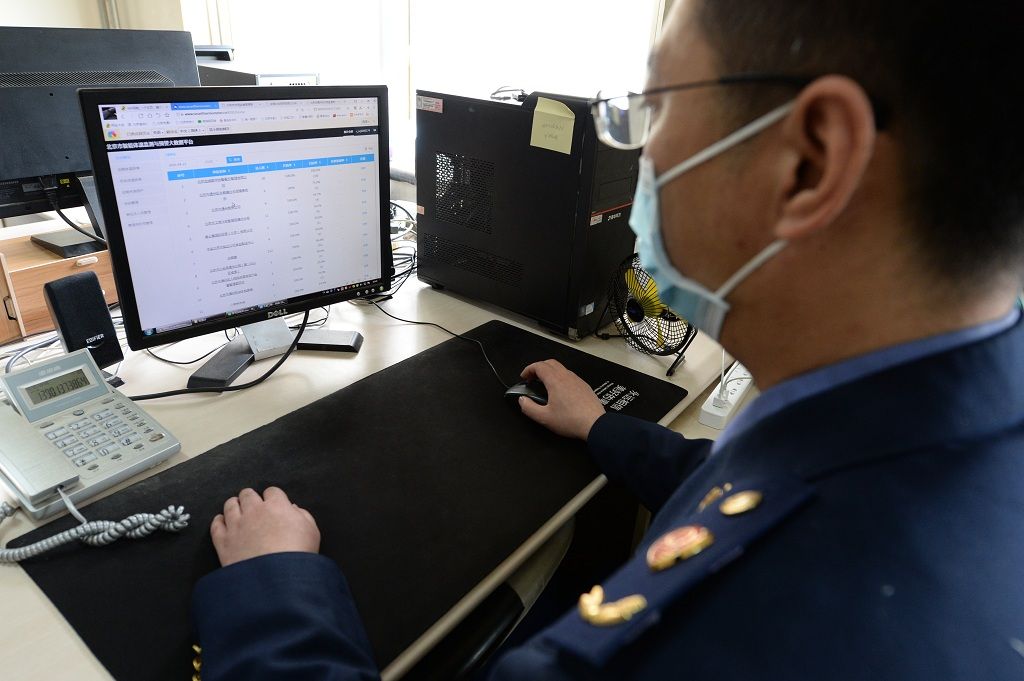 执法人员在北京市智能体温监测与预警大数据平台,实时监控餐饮从业人员体温情况。通州区市场监管局供图