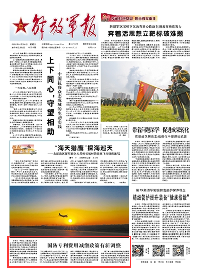 解放军报讯李晓红、王惠报道:在4月26日世界知识产权日来临之际,军委装备发展部有关部门根据财政部、国家发改委印发的《关于减免部分行政事业性收费有关政策的通知》,对国防专利费用减缴政策作出相应调整,减轻国防领域创新主体负担,激励国防科技和装备建设创新发展。