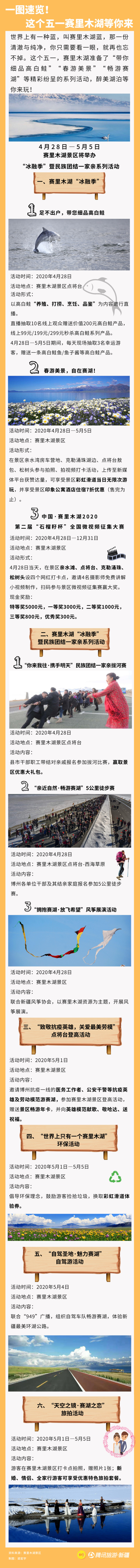 为了释放防疫形势持续向好的红利,全面推动文旅产业复苏,积极响应新疆维吾尔自治区、博尔塔拉州旅游兴疆战略,自2020年4月28日起至2020年5月5日,赛里木湖景区重磅推出“冰融季”暨民族团结一家亲系列活动。