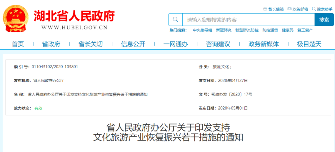 好消息!省政府发文啦!鼓励有条件的地方和机关企事业单位为职工周五下午与周末外出旅游创造有利条件!5月1日湖北省人民政府网站发布了《省人民政府办公厅关于印发支持文化旅游产业恢复振兴若干措施的通知》。