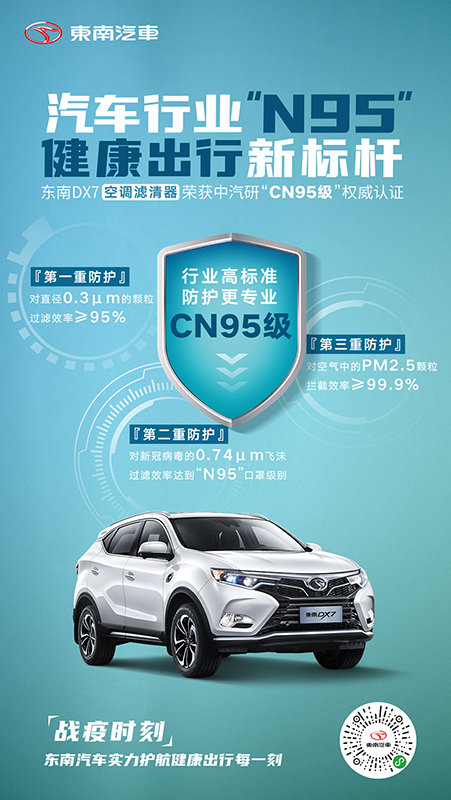 福汽集团东南汽车研发有深度,更有速度与广度。针对疫情期间,人们对“健康汽车座舱”的需求,福汽集团东南汽车快速响应,集合精锐力量进行技术攻关,成功打造的“N95型口罩”级别车载空调滤清器,通过了中国汽车技术研究中心旗下华诚认证中心的CN95认证。此空调滤清器技术上可支持东南DX全系车型搭载,东南DX7则为首款搭载车型。高效行动力和无畏使命担当,让市场和消费者感受到了福汽集团东南汽车的拳拳诚意,也必将助力福汽集团东南汽车品牌迈向更远更光明的未来!