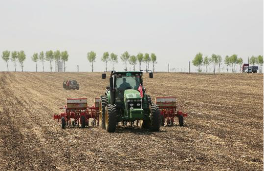 2020年5月17日,甘南县甘南镇万亩中草药规模种植示范基地,播种机在田间进行玉米套种工作。(甘南县委宣传部供图)