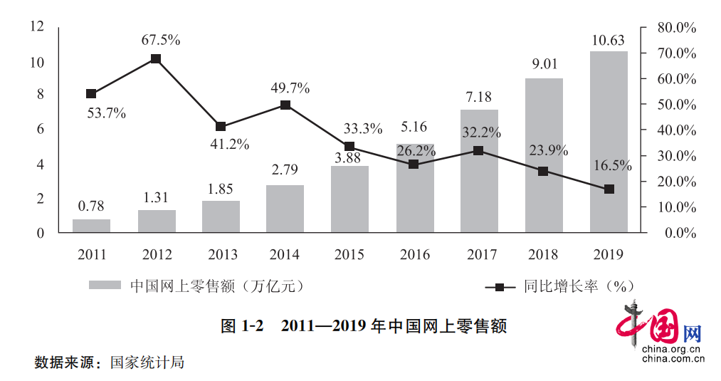 中国近9年网上零售额。《中国电子商务报告2019》截图