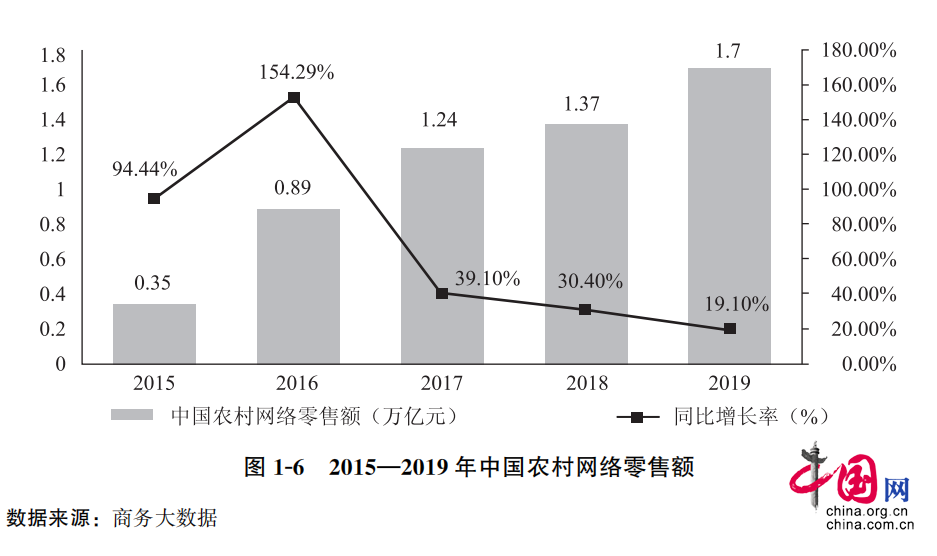 中国近9年农村网络零售额。《中国电子商务报告2019》截图