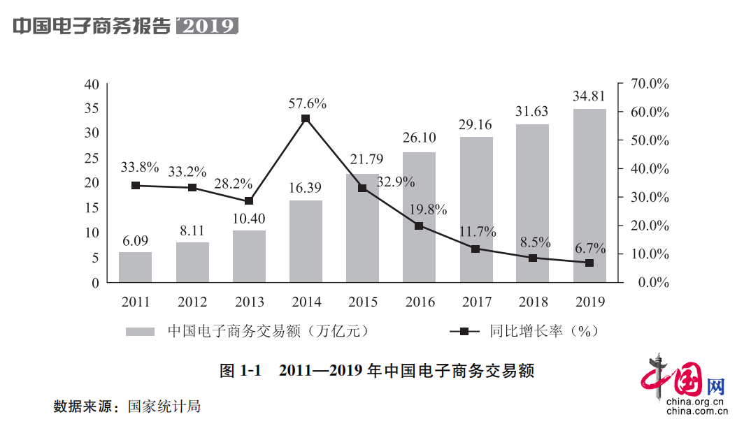 中国电子商务交易额近9年增长变化图。《中国电子商务报告2019》截图