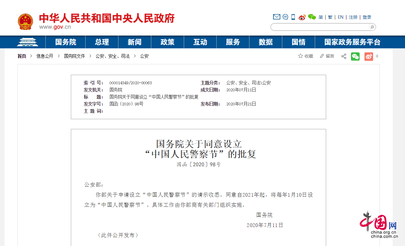 中国网政务7月21日讯 据中国政府网消息,刚刚,国务院发文同意公安部关于申请设立“中国人民警察节”的请示。国务院批文表示,自2021年起,将每年1月10日设立为“中国人民警察节”。自此,中国人民警察有了自己的法定节日,向可爱的人致敬!
