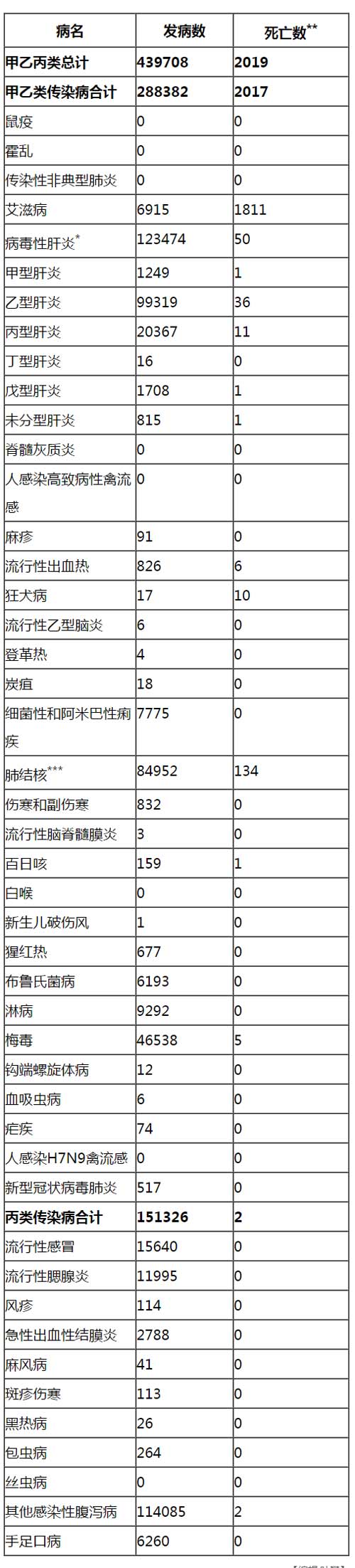消息称,其中甲类传染病中无发病死亡报告。乙类传染病中传染性非典型肺炎、脊髓灰质炎、人感染高致病性禽流感、白喉和人感染H7N9禽流感无发病、死亡报告,其余22种乙类传染病共报告发病288382例,报告死亡2017人。