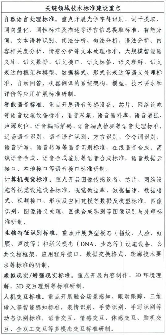 E关键领域技术标准主要围绕自然语言处理、智能语音、计算机视觉、生物特征识别、虚拟现实/增强现实、人机交互等方面,为人工智能应用提供领域技术支撑;