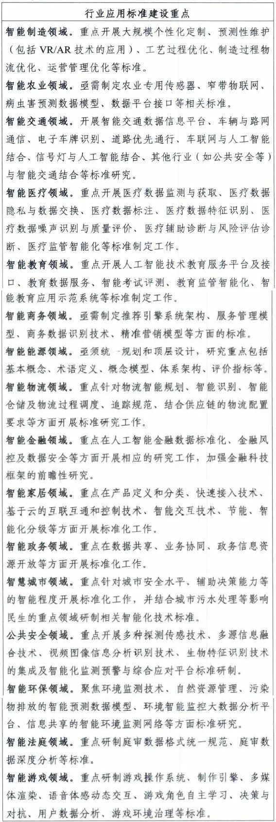 到2023年,初步建立人工智能标准体系,重点研制数据、算法、系统、服务等重点急需标准,并率先在制造、交通、金融、安防、家居、养老、环保、教育、医疗健康、司法等重点行业和领域进行推进。建设人工智能标准试验验证平台,提供公共服务能力。