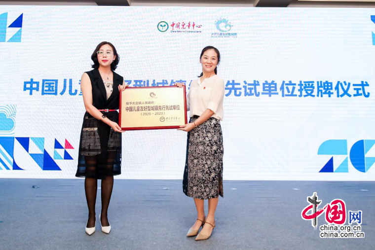 中国儿童中心向大云镇人民政府授予“中国儿童友好型城镇先行先试单位”称号,大云镇党委副书记、旅管委主任高敏丽(右)接牌。