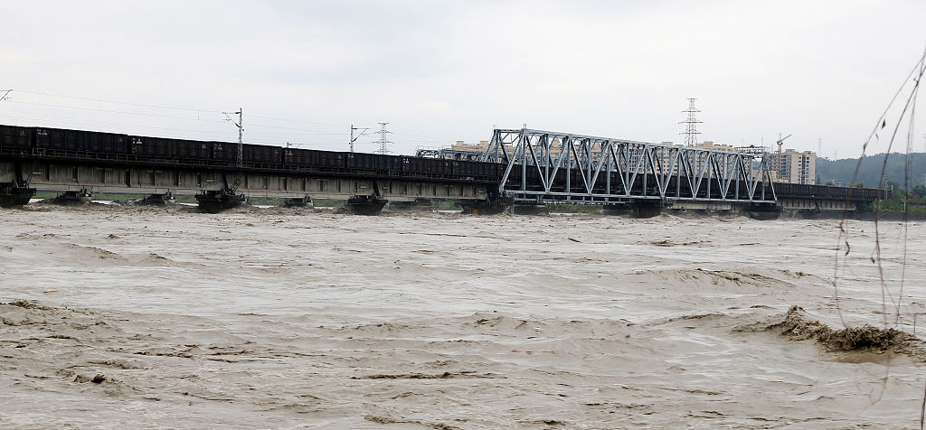 8月17日,四川绵阳市境内涪江流域水位迅速上涨,对宝成铁路涪江大桥造成影响,当日下午,铁路部门再次采取“重车压梁”的方式抗洪。(图片来源网络)
