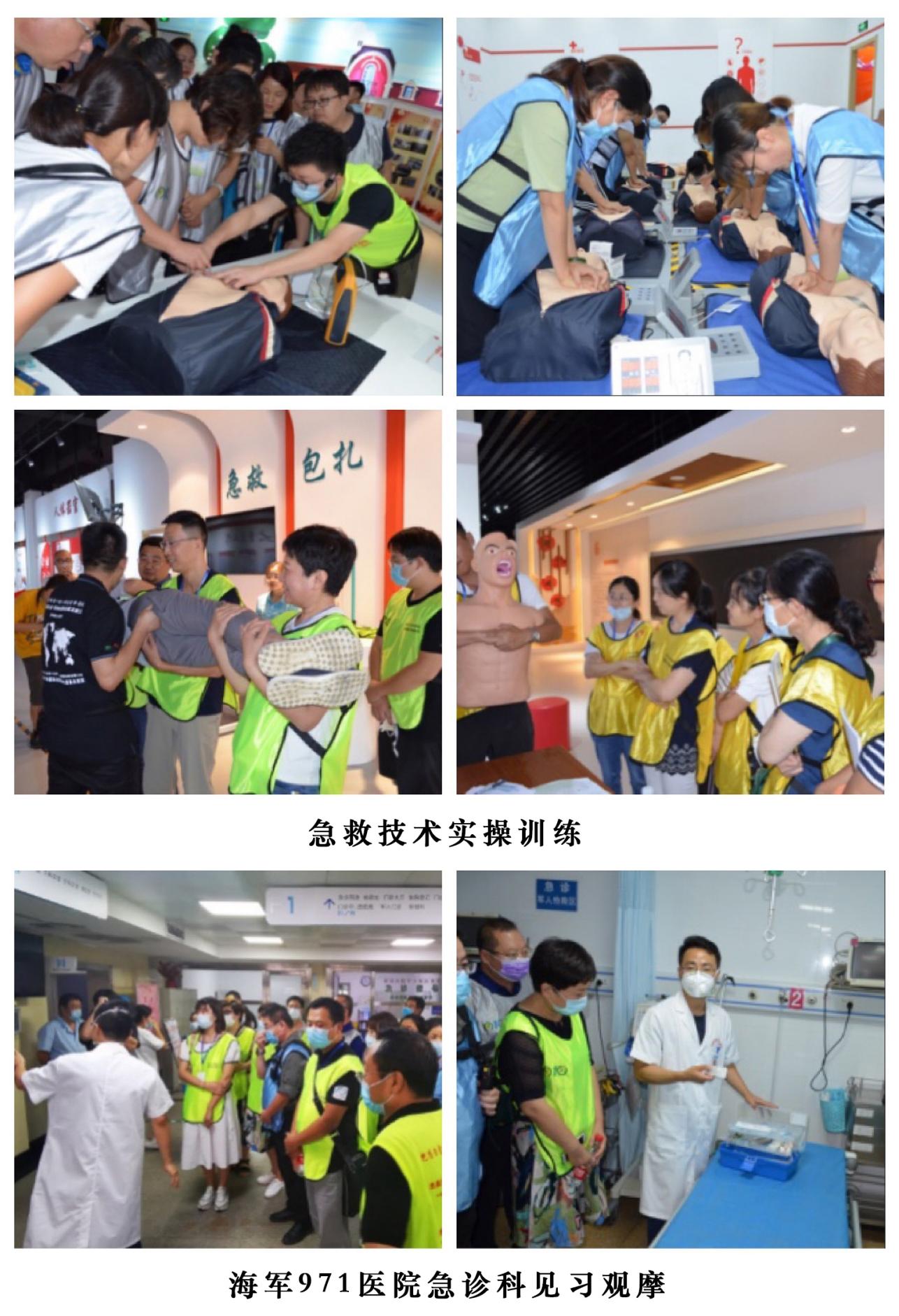 校医们通过培训系统掌握了急救现场安全原则、生命体征判断、徒手心肺复苏操作、解除气道异物梗阻、AED技术、创伤四大技术(止血、包扎、固定、搬运)、开放气道与气管插管等院前急救理论和技能,并到海军第971医院急诊科实地见习伤病员急诊入院的急救处置流程。