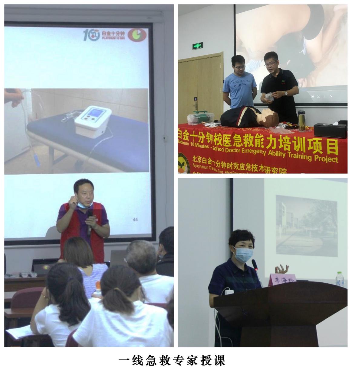 在为期三天的培训中,由解放军总医院第四医学中心重症医学科主任医师、白金十分钟理论创始人何忠杰博士、解放军海军第971医院重症医学科李海玲主任、枣庄薛城区人民医院急诊科主任杨刚三等一线急救专家组成的授课团队,以“白金十分钟急救全链条干预理论”为策略,通过教授校园时效应急急救体系建设理论、训练校园急救处置能力、分享一线伤病急救临床经验、培养安全救护科普能力、组织医院科室实地观摩等方式,从实战角度出发,以理论和实践相结合的模式提升校医的校园时效急救处置和与医院急救科室科学衔接的能力。