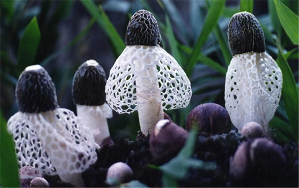 竹荪是寄生在枯竹根部的一种隐花菌类,形状略似网状干白蛇皮,它有深绿色的菌帽,在菌柄顶端有一围细致洁白的网状裙从菌盖向下铺开,被人们称为“雪裙仙子”、“菌中皇后”。竹荪具有滋补强壮、益气补脑、宁神健体的功效;补气养阴,润肺止咳,清热利湿。